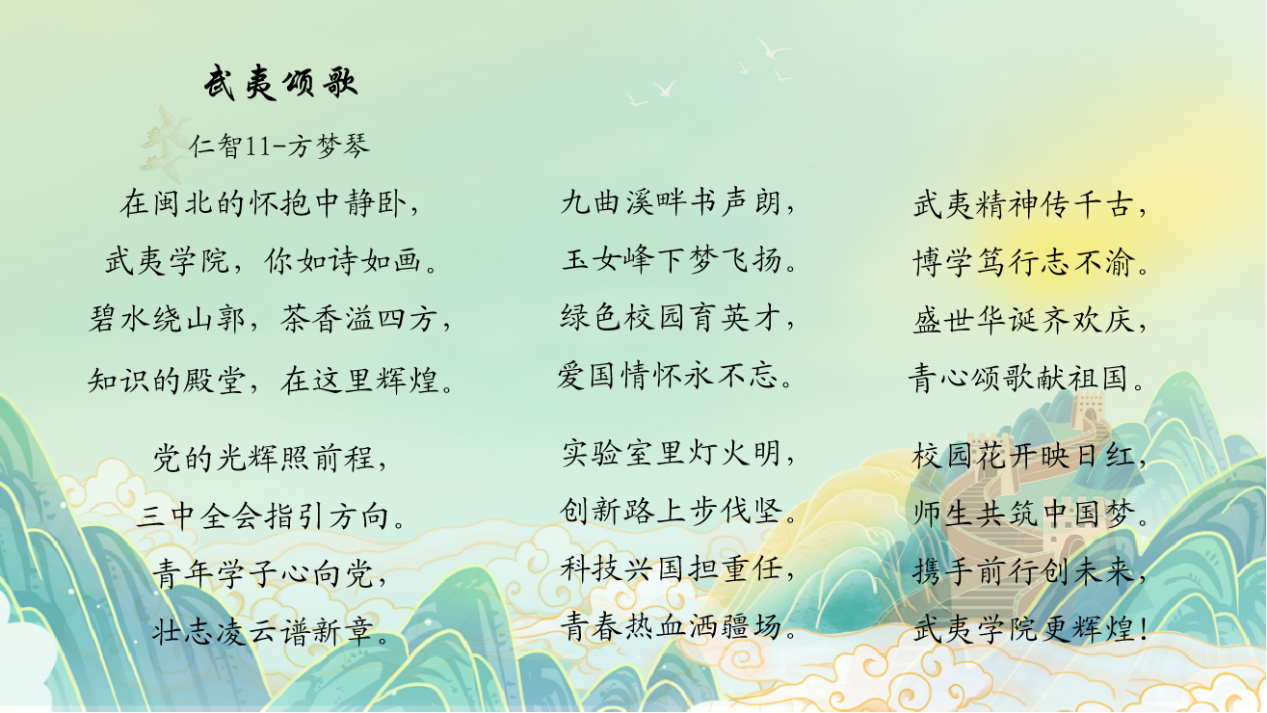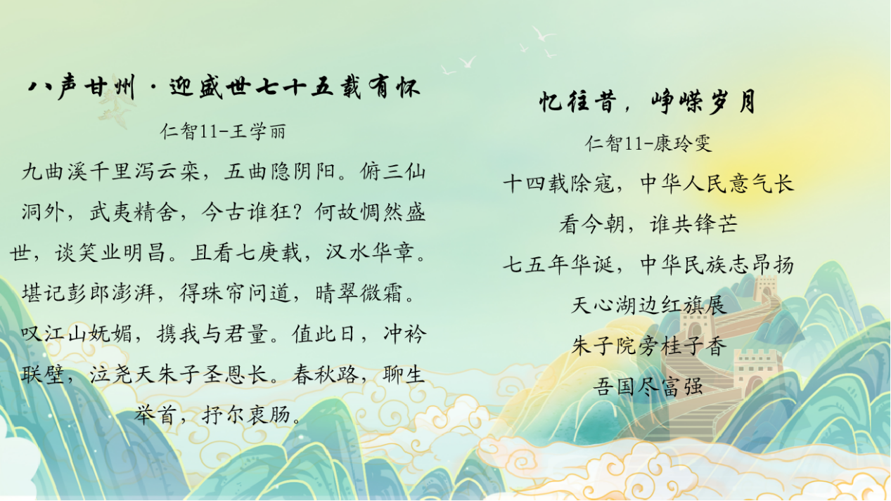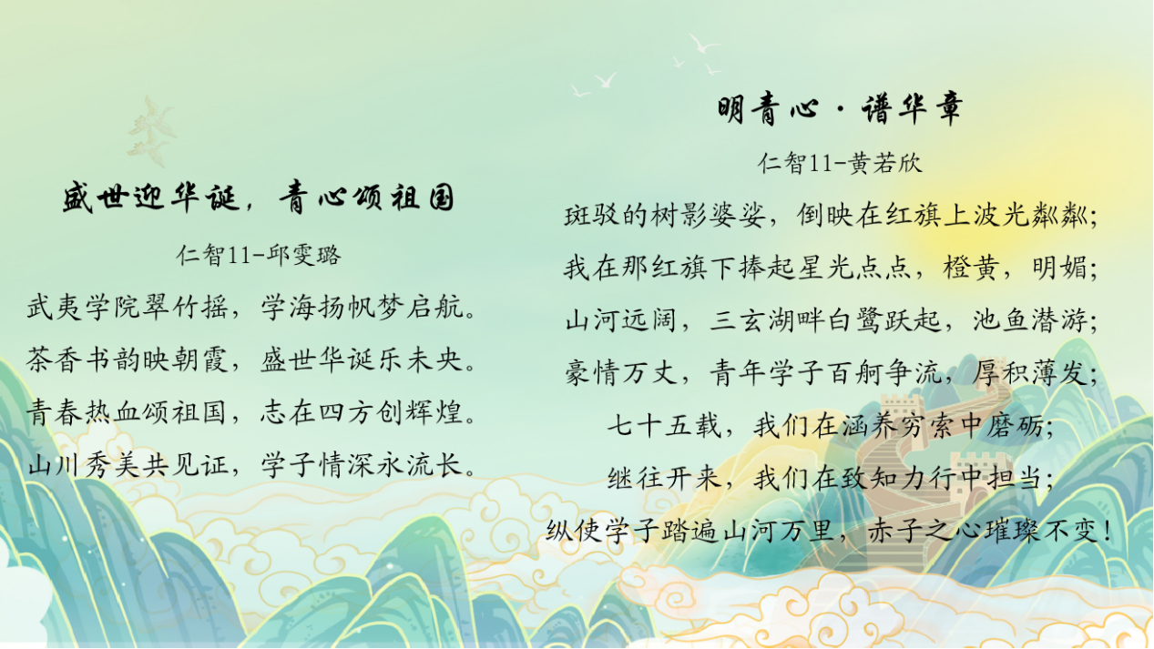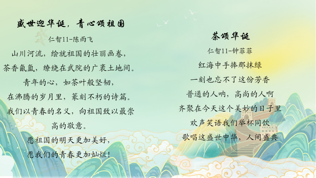 为深入学习贯彻党的二十届三中全会精神,增进大学生爱党爱国爱校情怀,在诗词的熏陶中体会秋日的无限风光。仁智11#楼栋党支部在国庆期间举办以“盛世迎华诞 青心颂祖国”为主题的诗歌征集活动。活动面向楼栋全体同学开展线上征集诗词活动,充分展现当代青年学生健康向上的精神面貌,传承和发扬中华优秀传统文化,让中国传统诗歌文化在社区散发光芒。