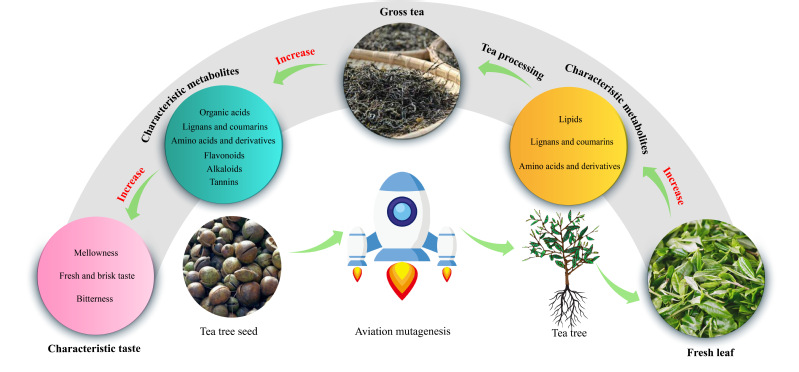该研究首次分析了航空诱变对大红袍鲜叶及毛茶代谢物含量与滋味特征的影响。研究发现,航天诱变显著改变茶叶中不同代谢物的含量,提高了大红袍鲜叶中的脂质、木脂素、氨基酸及其衍生物含量;提高了毛茶中的生物碱、单宁、类黄酮、木脂素、香豆素、氨基酸及其衍生物、有机酸等含量。航天诱变后的茶树,其茶叶品质显著增强。本研究为航空诱变大红袍的加工、茶叶产品开发及推广奠定了重要的基础。