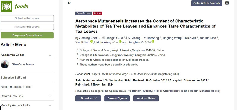 该成果以“Aerospace mutagenesis increases the content of characteristic metabolites of tea tree leaves and enhances taste characteristics of tea leaves”为题发表在《Foods》期刊(JCR1区,IF=4.7)。我校茶与食品学院本科生陈嘉铭为第一作者,叶江华教授为通讯作者。