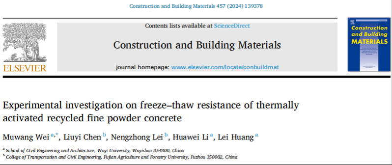 该研究成果以“Experimental investigation on freeze–thaw resistance of thermally activated recycled fine powder concrete”为题发表在国际权威期刊《Construction and Building Materials》(中科院一区Top期刊)。第一作者魏木旺,武夷学院为第一单位。文章链接:https://doi.org/10.1016/j.conbuildmat.2024.139378。