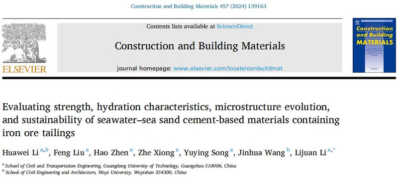 该研究成果以“Evaluating strength, hydration characteristics, microstructure evolution, and sustainability of seawater–sea sand cement-based materials containing iron ore tailings”为题,发表于国际权威期刊Construction and Building Materials(中科院一区top,IF=7.4)。李华伟为论文第一作者。该研究得到国家自然科学基金重点项目(12032009)的支持。