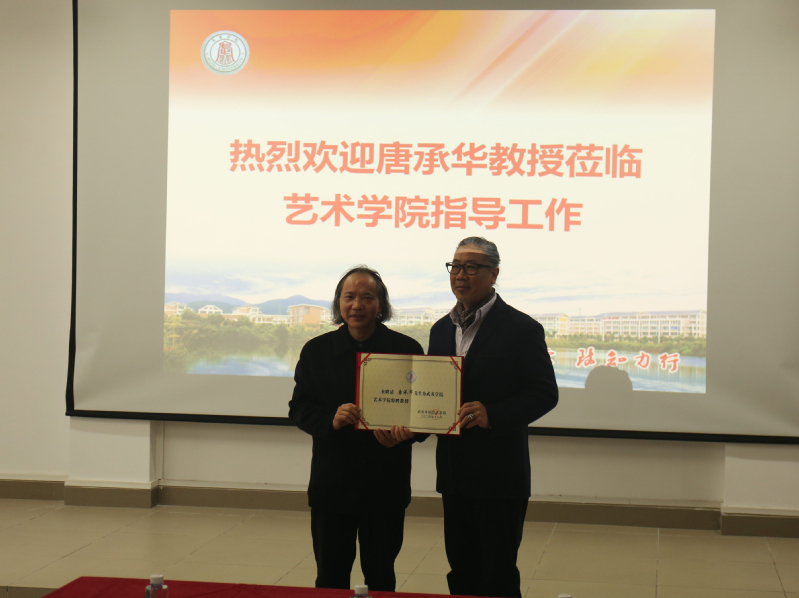 在校期间,唐承华教授为艺术学院师生开展“艺术创作中的自我意识”“艺术中的场域精神”多场专业讲座,并接受艺术学院颁发特聘教授聘书。