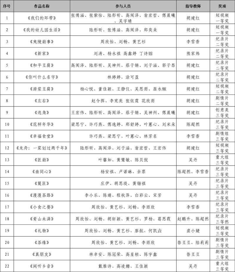 本次比赛,我校广泛宣传发动,专业教师指导学生组建了多个创作团队,遴选以红色文化传承、地方文化传播为主题的作品参赛。共40部作品闯入决赛,最终获得一等奖2项,二等奖6项,三等奖14项。
