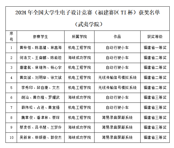 近日,2024年全国大学生电子设计竞赛(福建赛区TI杯)颁奖大会暨总结交流会在福州大学举行。此次全省共有36所学校,1504支队伍参赛,其中我校机电工程学院与海峡成功学院共选派30支队伍参赛,获得省级一等奖1项、二等奖4项,三等奖5项。