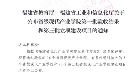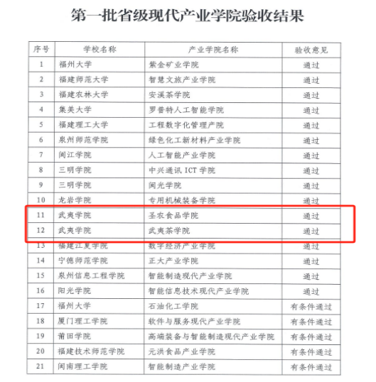 近日,福建省教育厅、工信厅公布了省级现代产业学院第一批验收结果,我校圣农食品学院、武夷茶学院等2个省级首批现代产业学院均顺利通过验收。