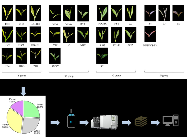 目前,茶树叶片的颜色主要有绿色、白色、黄色和紫色,不同叶色的茶树在研究和观赏方面具有重要潜力。现有研究大多集中在不同叶色茶叶的形成机制和干茶品质差异,探讨了相关基因在调控叶色中的作用,以及非挥发性代谢物对茶叶品质的影响。然而,关于不同叶色茶树种质资源的挥发性香气化合物的系统研究尚显不足。现有研究大多集中于少数几种茶树品种或单一叶色类型的香气成分分析,尤其是对异色茶树与绿叶茶树之间的香气成分对比研究仍然较为匮乏。此外,异色茶树的特征香气化合物仍未明确。
