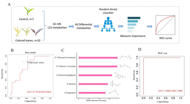 在这项研究中,作者以保存在武夷学院茶树种质资源圃的7个白化、9个黄化、4个紫化和7个正常(绿色)茶树种质为研究对象,利用顶空固相微萃取(HS-SPME)结合GC-MS技术分别对所选茶树种质芽叶的挥发性化合物进行了分析,共鉴定到125个香气代谢物。对异色茶树和绿色茶树的香气化合物分别进行比较,发现白化茶中上调的化合物最多,主要是以花果香为主的化合物,包括橙花醇、Z-异香叶醇和E-3-己烯醇乙酸酯等。紫化茶中下调的化合物最多,包括与清香和果香有关的β-月桂烯、苯甲醇和水杨酸甲酯等。根据VIP值和p-value,共筛选到40个差异化合物,其中在3个异色茶中共有的是Z-3-己烯醇、1壬醇、2,4-叔丁基苯酚和2,6,10,15-四甲基庚烷。利用这些差异代谢物构建的随机森林模型筛选出异丁酸叶醇酯、E-3-己烯-1-醇乙酸酯、2,4-二叔丁基苯酚、Z-茉莉酮和Z-异香叶醇等5个香气代谢物,通过本研究筛选到的香气生物标志物在一定程度上为判别茶树叶色提供了有价值的候选因子。
