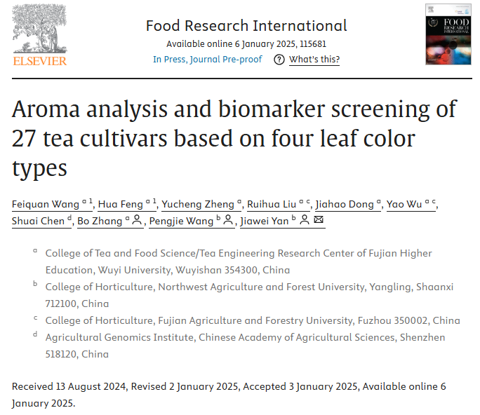 相关研究以“Aroma analysis and biomarker screening of 27 tea cultivars based on four leaf color types”在国际期刊Food Research International(中国科学院一区top)上发表。王飞权副教授为第一作者,张渤副研究员为共同通讯作者,武夷学院为第一完成单位。