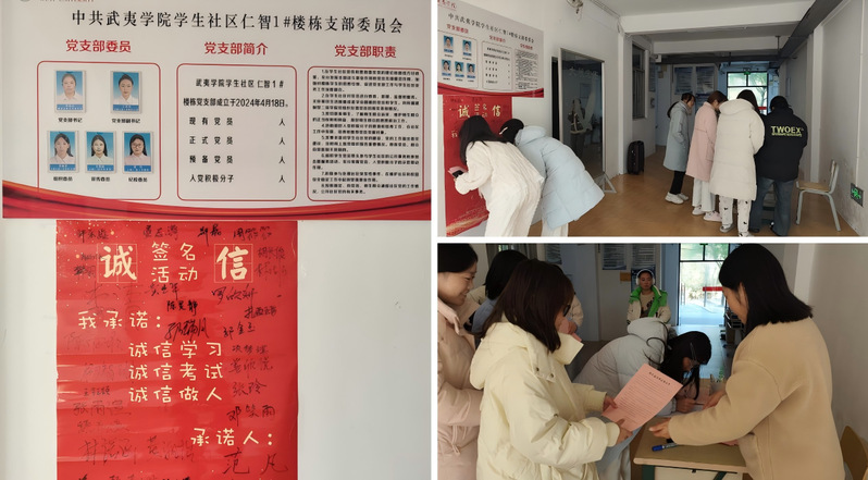 为进一步加强学风建设,严肃考风考纪,营造诚实守信的考试环境,充分发挥学生楼栋社区党员示范引领作用,各楼栋党支部积极开展期末考试诚信教育主题活动。仁智1#楼栋党支部开展“诚信期末考试倡议”宣传与实践活动,学生党员深入宿舍宣传诚信考试的重要意义,在宿舍楼的诚信考试签名墙上签下自己的承诺,以身作则,共同努力营造良好学风、考风;仁智22#楼栋党支部开展“党员身份亮起来,诚信考试做表率”主题党日活动;兴贤2#楼栋党支部开展“严肃考风考纪,建设优良学风”主题座谈会,集中学习校规校纪;仁智12#楼栋党支部开展期末诚信考试宣传教育活动,集中学习《武夷学院学生考试违规处理办法》。
