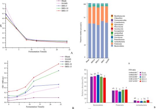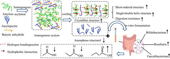 抗性淀粉是一种不易被小肠消化的碳水化合物,能选择性刺激结肠内有益菌的生长,被誉为“第二类膳食纤维”。然而,其在大肠发酵主要产生乙酸丙酸,而丁酸的产生较少,丁酸对能量供应和改善肠道健康有重要作用。因此,如何增加丁酸的产生成为改善代谢健康的关键。我校茶与食品学院孙辉博士团队聚焦于不同取代度的丁酰化抗性淀粉(BRS)合成,发现90%的BRS在小肠外消化后仍存在。通过结肠下行模拟系统,观察到这些淀粉消化产物发酵速率均匀且缓慢,丁酸浓度随取代度增加而上升。进一步的16S rRNA基因测序和主成分分析表明,高直链玉米淀粉中丁酸取代程度的提高显著增加了关键细菌属的相对丰度,包括Ligilactobacillus、Roseburia、Bifidobacterium、Faecalibacterium和Parabacteroides,同时BRS10导致Bacteroides减少。这些变化与BRS结构的稳定性和缓慢发酵特性有关,显著提高了丁酸水平。研究表明,丁酰化抗性淀粉作为一种有前景的功能成分,可通过调节发酵副产物和肠道微生物群落来增强结肠健康,并预防相关疾病。这一发现为开发新型功能性食品和改善人类健康提供了重要科学依据。