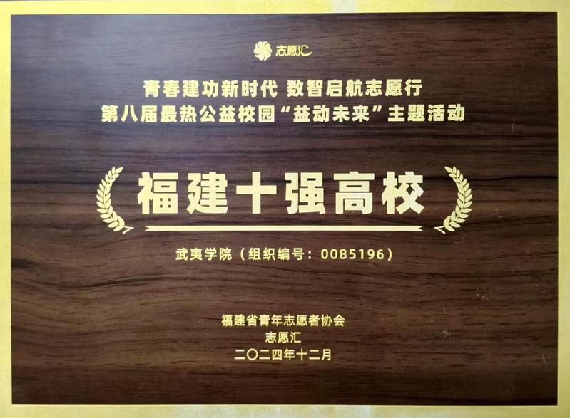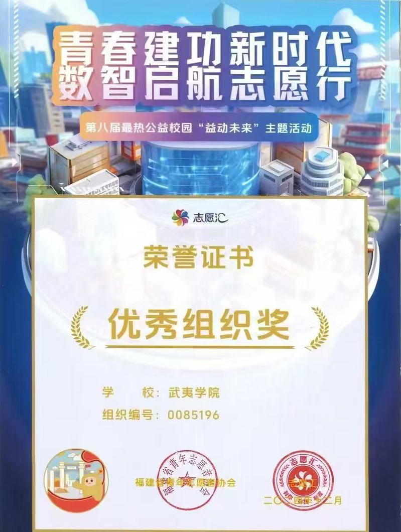 近日,在福建省青年志愿者协会、志愿汇举办的“青春建功新时代 数智启航志愿行”第八届最热公益校园“益动未来”主题活动中,我校凭借优秀的组织能力与创新实践,斩获“优秀组织奖”及“福建十强高校”两项殊荣。