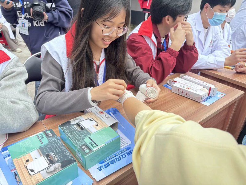 校红十字会志愿者为村民普及急救知识。在急救知识宣传区,志愿者们讲解了心肺复苏、气道异物梗阻等急救技能,提升村民的应急处理能力。创伤包扎介绍区,志愿者们演示并传授常见创伤包扎方法,帮助村民掌握基本急救技能,为日常生活增添一份安全保障。