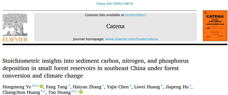 在森林转换增加和气候异常频繁的背景下,该研究为化学计量学在森林水库沉积物中对C、N和P沉积的动态反馈机制提供了新的见解,并指出了造林和防洪堤建设在减轻森林转换对土壤侵蚀的负面影响方面是有效的。该成果以《Stoichiometric insights into sediment carbon, nitrogen, and phosphorus deposition in small forest reservoirs in southeast China under forest conversion and climate change》为题发表于Elsevier旗下分析化学期刊《Catena》(中科院1区Top)。