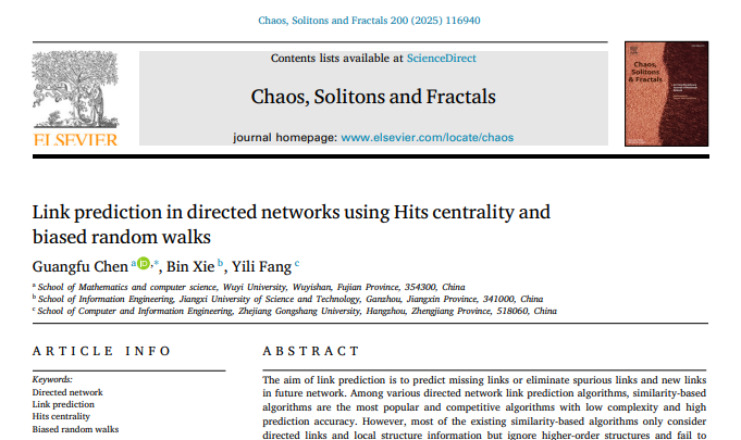 研究成果以“Link prediction in directed networks using Hits centrality and biased random walks”为题,发表于国际权威期刊《Chaos, Solitons & Fractals》/(中国科学院一区Top,IF=5.6)。我校数学与计算机学院陈广福博士为第一和通讯作者,江西理工大学谢斌博士和浙江工商大学方毅立博士为共同作者,武夷学院为第一完成单位。