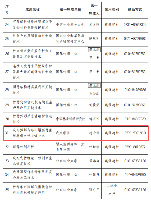 日前,中国国家林草局发布的“以竹代塑”重点推广科技成果,我校竹资源创新利用团队潜心研发的“定向拆解与硅铝增强竹重组材耐久性关键技术”成功入选。此次,中国国家林草局发布的37项“以竹代塑”重点推广科技成果,福建省共有三项成果入选。