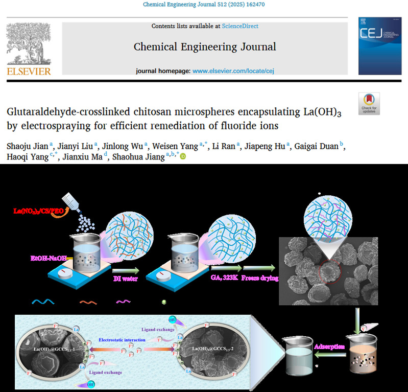 本研究团队联合南京林业大学和扬州大学科研团队,采用静电喷雾技术设计制备出两种壳聚糖基微球(La(OH)3@GCCSx-1和La(OH)3@GCCSx-2),作为高效除氟剂。全面评估了上述两种微球的除氟性能、选择性、循环使用性能及除氟机理。这两项成果不仅为开发高效稳定的除氟脱磷吸附剂提供了新思路,也为水污染治理和生态环境保护提供了重要的理论与技术支持。