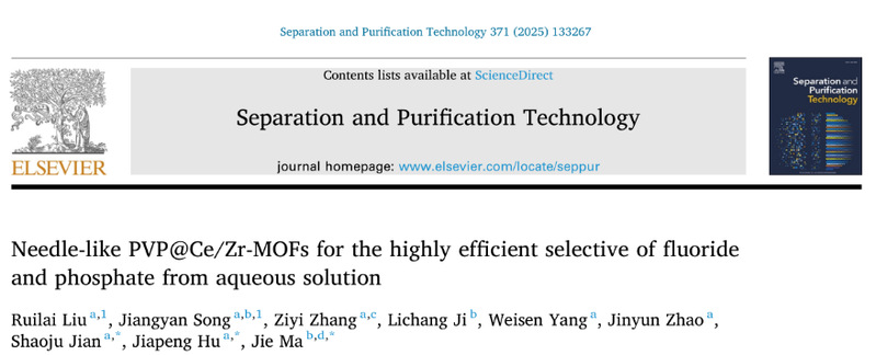 上述两项研究成果分别以《Glutaraldehyde-crosslinked chitosan microspheres encapsulating La(OH)3 by electrospraying for efficient remediation of fluoride ions》为题,发表于工程技术与化学化工领域顶级期刊《Chemical Engineering Journal》(中国科学院一区TOP,IF=13.2)。生态与资源工程学院简绍菊博士为第一作者,生态与资源工程学院杨为森教授、南京林业大学蒋少华教授和扬州大学杨皓奇教授为文章共同通讯作者。以《Needle-like PVP@Ce/Zr-MOFs for the highly efficient selective removal of fluoride and phosphate from aqueous solution》为题,发表于国际著名期刊《Separation and Purification Technology》(中国科学院工程技术二区TOP期刊,IF=9.7),生态与资源工程学院刘瑞来博士为论文第一作者,生态与资源工程学院胡家朋教授、简绍菊副教授和同济大学马杰教授为文章共同通讯作者。该两项研究成果第一完成单位均为武夷学院。