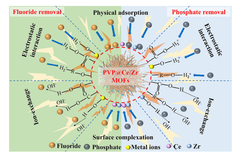 为此,我校生态与资源工程学院环境功能材料开发与应用研究团队,联合同济大学和福州大学科研团队,创新性地引入聚乙烯吡咯烷酮(PVP)分散剂,采用水热法合成了针状 PVP@Ce/Zr-MOFs 吸附剂。该材料在结构设计上实现了稳定分散和择优晶体取向,表现出优异的同步除氟脱磷性能。该材料在 pH 2~10 宽范围内保持高效吸附能力,在实际废水中同样展现出良好的选择性与稳定性。其最大吸附容量分别达到 169.49 mg/g(氟离子)和 140.85 mg/g(磷酸盐),明显优于常见吸附剂。机理分析进一步揭示了其通过电荷相互作用、配位交换和表面络合等多重机制实现对氟和磷的高效去除。同时,该团队开展了实际废水处理与循环再生实验,结果显示该新型材料在多次循环后仍保持较高的除氟能力,并能有效将废水中氟离子与磷酸盐浓度降至饮用水安全标准以下,展现出良好的工程应用前景。