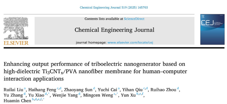 该研究成果以《Enhancing output performance of triboelectric nanogenerator based on high-dielectric Ti₃CNTₓ/PVA nanofiber membrane for human–computer interaction applications》为题,在线发表于工程技术与化学化工领域顶级期刊《Chemical Engineering Journal》(中国科学院一区TOP 期刊,IF=13.3)。生态与资源工程学院刘瑞来博士为第一作者,陈华民研究员为通讯作者,武夷学院为第一完成单位。