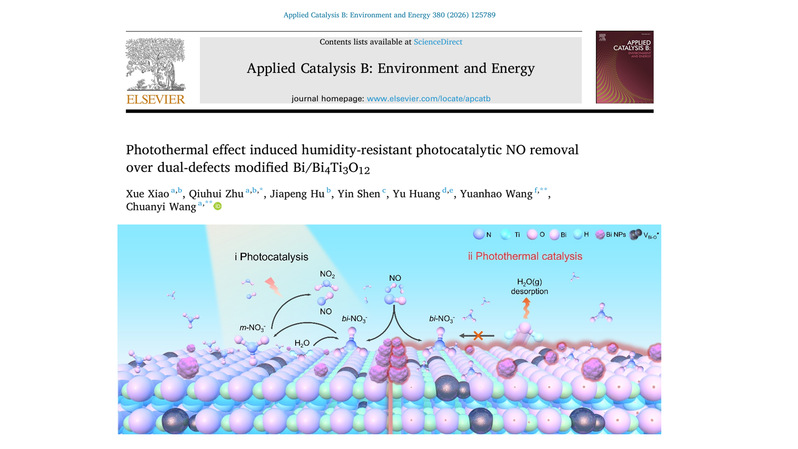 该研究成果以《Photothermal effect induced humidity-resistant photocatalytic NO removal over dual-defects modified Bi/Bi4Ti3O12》为题,发表于环境科学与工程领域顶级期刊《Applied Catalysis B: Environment and Energy》(中国科学院一区TOP,IF=21.1)。我校联合培养硕士研究生肖雪为第一作者,生态与资源工程学院祝秋会博士为第一通讯作者,北京科技大学汪远昊教授和陕西科技大学王传义教授为共同通讯作者。