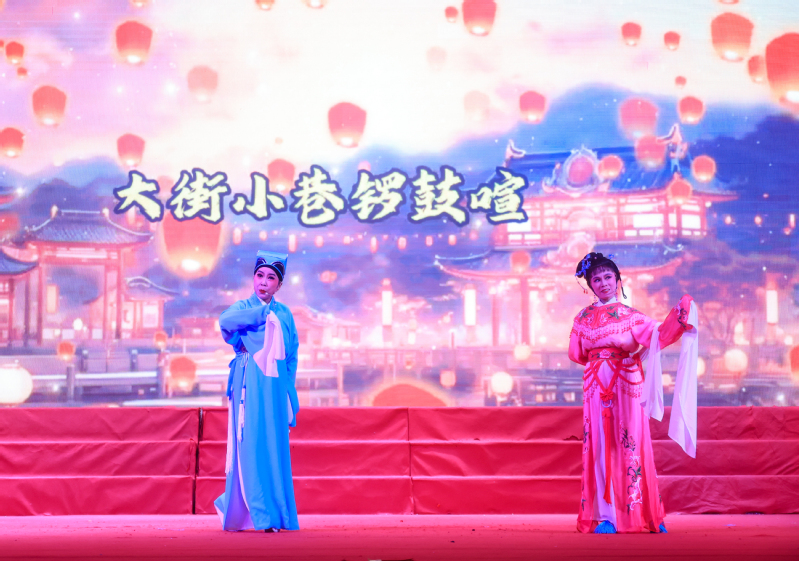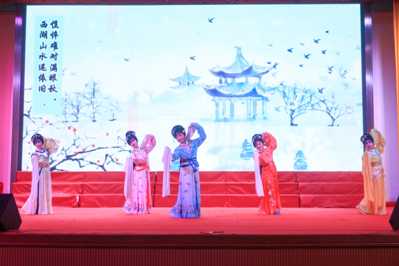 演出在气势恢宏的开场节目《群狮起舞》中拉开帷幕。经典越剧折子戏《五女拜寿·前拜寿》通过讲述杨继康五个女儿女婿前来拜寿的热闹场景,以及其中展现的人情冷暖、世态炎凉,引导大家感悟传统孝道文化和为人处世的道理,在欣赏艺术的同时受到传统美德的熏陶。越剧折扇表演《越韵古诗》将古典诗词意境美与越剧声腔美、折扇舞姿美巧妙融合。越剧折子戏《孔雀东南飞》以深情悲切的唱腔和充满张力的表演,将焦仲卿与刘兰芝夫妇对爱情的忠贞不渝和对封建礼教的反抗精神表现得淋漓尽致。充满生活气息的越剧折子戏《追鱼·观灯》以活泼诙谐的表演,再现张珍与鲤鱼精在元宵佳节共赏花灯的浪漫情景。昆曲团扇表演《长生殿》为现场注入古典雅致色彩,在舒缓乐曲中演绎唐明皇与杨贵妃缠绵悱恻的故事片段。《游子吟之出嫁了》深情演绎慈母对即将出嫁女儿的殷殷嘱托,触动在场每个人心底的感恩之情。《梁祝·我家有个小九妹》则将祝英台女扮男装、求学途中的活泼娇俏展现得活灵活现。一曲情深意切的越剧《送王郎》将牵挂、叮咛与祝福融入每一个音符和眼神之中,让人体会到传统情感中深厚的家国情怀与个人情谊。越剧《绣红旗·红梅赞》以坚定有力的唱腔和饱含深情的表演,再现了江姐等革命先烈在狱中绣制红旗、期盼胜利的感人场景,“线儿长,针儿密,含着热泪绣红旗”的激昂旋律,深刻展现了革命志士对党的无限忠诚和对共产主义信仰的执着追求。
