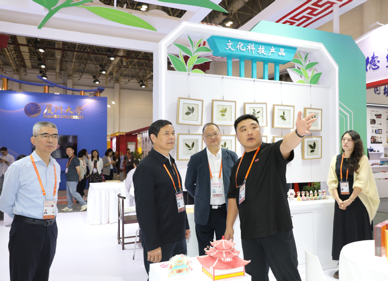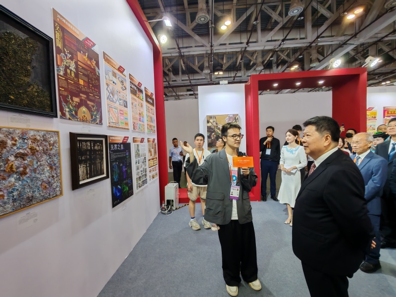 开幕式当天,福建省教育厅二级巡视员何光辉到我校展区与师生交流,详细了解作品背后的创作理念和成果转化情况,对展区呈现的“文创+科技”融合特色以及我校办学成果给予高度评价。