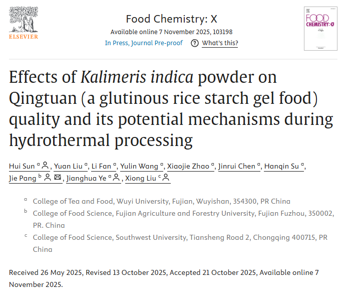 本研究得到南平市科技局资源产业化学联合创新项目(N2021Z005)和福建省科技厅自然科学基金(2025J011068)的资助和支持。研究成果的发表,不仅提升了我校在食品科学领域的学术影响力,也为传统食品产业创新发展提供了理论支撑,是实现科研成果服务地方经济发展的生动实践。