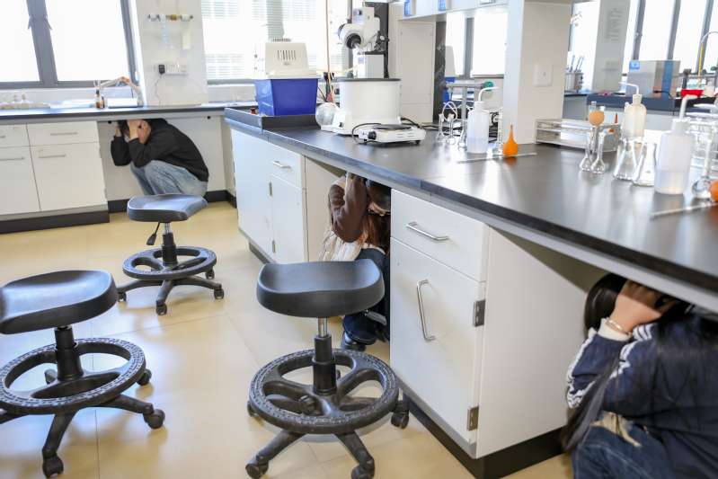 第一阶段地震和消防应急疏散演练。模拟发生地震,教学楼屏山13#的师生应急避险,迅速关闭火源、电源、气源等,处理好易燃、易爆、易起化学反应的物品,就近蹲或趴在课桌、实验台的旁边或承重墙的墙根、墙角,同时抓紧结实物体,用手或其它柔软物品保护好头部。地震暂停后,迅速组织师生疏散,有序撤离教学楼,安全到达指定疏散点集合。