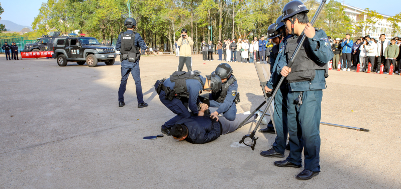 第二阶段反恐防暴演练。演练正式开始,模拟情感纠纷矛盾升级,1人手持管制刀具在体育馆前进行伤害袭击。学院路派出所、武装部(保卫处)按照“警校联动”机制立即赶赴现场处置,阻止伤害。形势危急时刻,武夷山市公安局特警大队接到调警,迅速启动“校园暴力恐怖事件预案”,立即抵达现场,将嫌疑人控制。至此,反恐防暴警报解除。民警对本次活动进行总结,详细讲解遇到“暴恐分子”时学校安保人员、教师、学生应该如何躲避危险、自救自护。武夷山市公安局特警大队还现场开展“全民反恐,共创平安”警用装备展示活动。