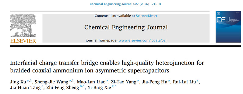 研究成果以“Interfacial charge transfer bridge enables high-quality heterojunction for braided coaxial ammonium-ion asymmetric supercapacitors”为题在线发表在国际权威期刊《Chemical Engineering Journal》(中科院一区TOP期刊,IF=13.3),我校徐晶博士和我校联合培养硕士研究生王胜杰为第一作者,厦门大学郑志锋教授和东南大学谢一兵教授为共同通讯作者,武夷学院为论文第一完成单位。