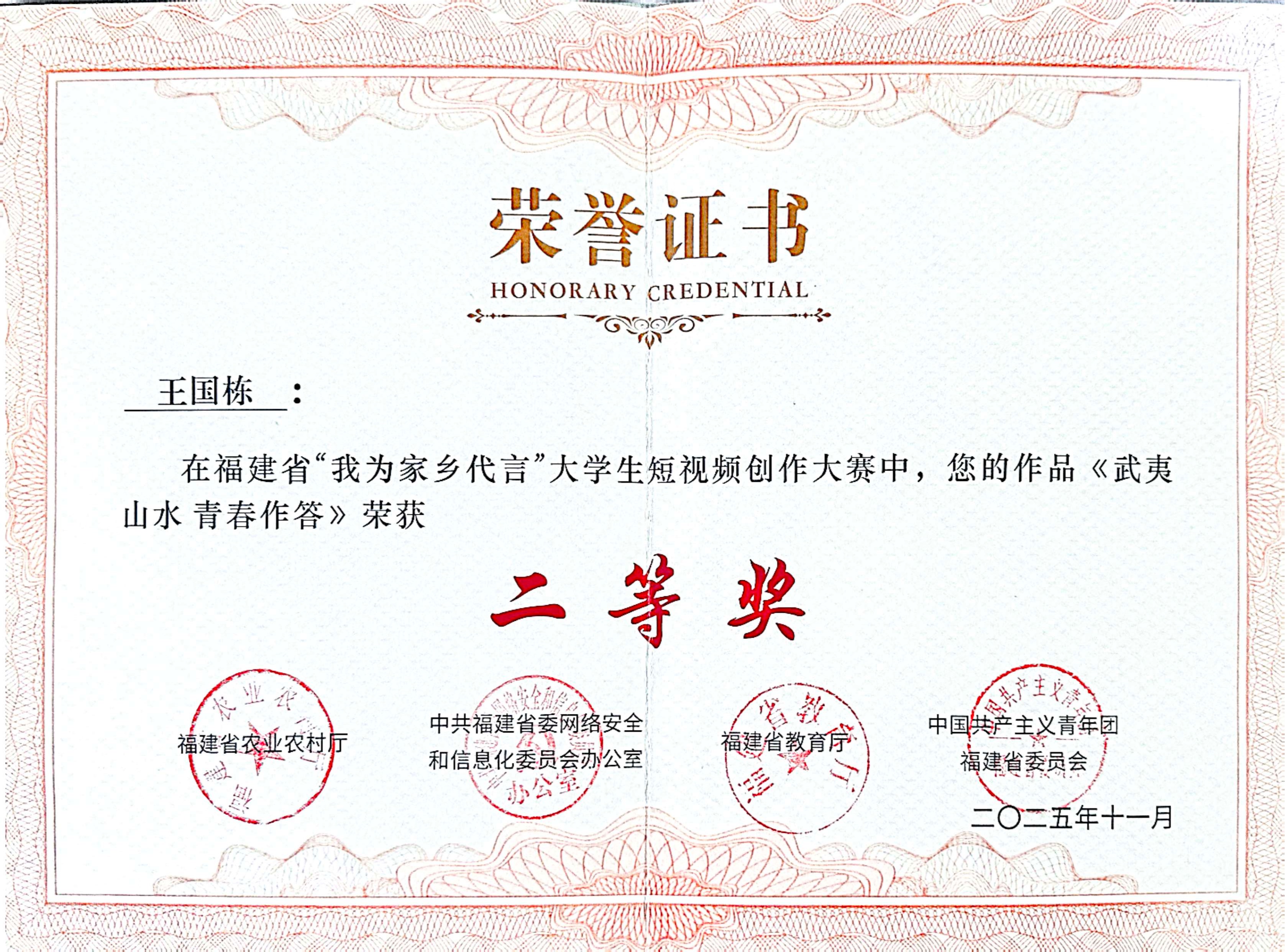 近日,2025年福建省“新农人”风采展示活动暨“我为家乡代言”大学生短视频创作大赛在福州大学城文化艺术中心落下帷幕,我校选送的短视频作品《武夷山水青春作答》获大学生短视频创作大赛二等奖。