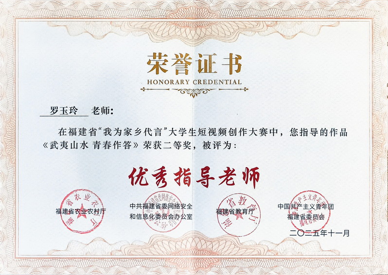 据悉,本次短视频大赛共吸引全省19所高校参与,参赛作品内容丰富、形式多样、富有创意,展现了福建大学生情系桑梓、助力乡村振兴的昂扬姿态,共评选出一等奖5名、二等奖8名、三等奖13名。我校获奖作品《武夷山水青春作答》由大学生创新创业园在孵项目“武夷山市成书影视有限公司”负责人王国栋同学拍摄完成,镜头聚焦新一代武夷山人,用科技激活茶产业、以创新焕新乡风文明、靠奋斗实现家门口富裕,以青春行动诠释家园发展,书写新时代乡村的生机与可能,以青年视角与诗意叙事,展现武夷山乡村振兴图景,荣获二等奖第一名,指导老师罗玉玲获“优秀指导老师”。