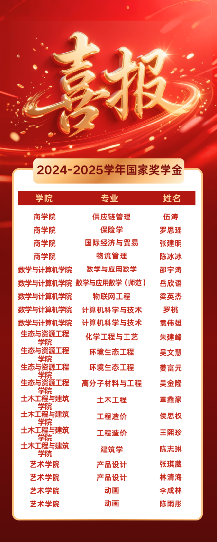 近日,教育部公布2024—2025学年度本专科生国家奖学金获奖学生名单,我校41名学子荣获国家奖学金,奖励标准为每生10000元。