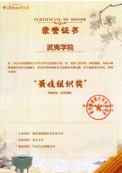 近日,由教育部港澳台事务办公室主办的2025年全国港澳台大学生中华文化知识大赛在复旦大学落幕,我校荣获“最佳组织奖”。