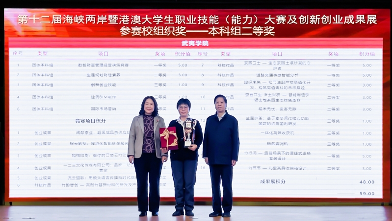 近日,由福建省教育厅、福建省人力资源社会保障厅、福建省互联网信息办公室、平潭综合实验区管委会联合举办的第十二届海峡两岸暨港澳大学生职业技能(能力)大赛及创新创业成果展获奖名单公布,我校在创新创业成果展中荣获一等奖5项、二等奖6项、三等奖5项,获奖数量创历史新高,且获奖数量和等次均居全省第一;在职业技能(能力)大赛中获一等奖1项、二等奖1项、三等奖3项。我校在此次赛事中积极发动、精心组织、扎实推进、全力保障,凭借在赛事中的优秀表现荣获“优秀组织奖”,全省共有六所高校获此殊荣。