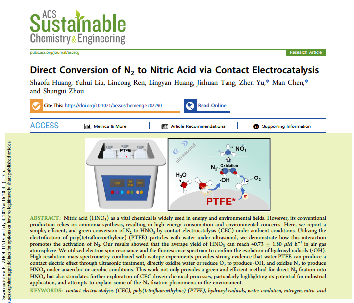 研究了一种在常温常压下通过接触电催化(CEC)将氮气(N2)高效、绿色、简便地转化为硝酸(HNO3)的方法。通过超声作用下聚四氟乙烯(PTFE)颗粒与水接触起电,产自由基,并借助界面强电场的协同作用,实现N2的直接氧化生成HNO3。这项工作为将N2直接固定为HNO3提供了绿色高效的途径,推动了CEC驱动化学过程的深入探索,尤其凸显了其工业应用潜力,同时也为阐释自然界中部分固氮现象提供了新的思路。