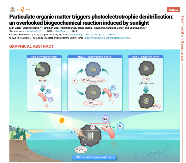 研究成果以“Particulate organic matter triggers photoelectrotrophic denitrification: An overlooked biogeochemical reaction induced by sunlight”为题,发表在国际综合类学术期刊《The Innovation》(5年平均影响因子:40.2)姊妹刊《The Innovation Geoscience》,武夷学院黄绍福博士和福建农林大学周顺桂教授为共同通讯作者。