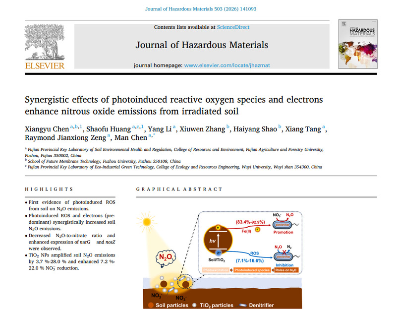 研究成果以“Synergistic effects of photoinduced reactive oxygen species and electrons enhance nitrous oxide emissions from irradiated soil”为题,发表在国际权威期刊《Journal of Hazardous Materials》(中科院1区Top,IF=11.3)。福州大学陈翔宇博士和武夷学院黄绍福博士为共同第一作者,福建农林大学陈曼教授为通讯作者。