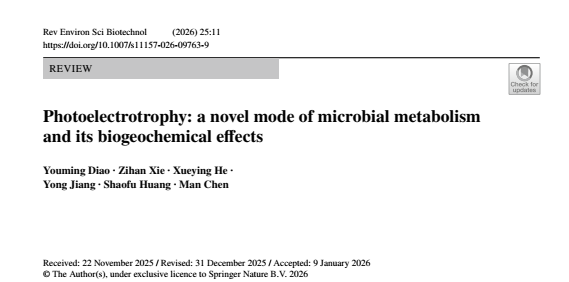 研究成果在以“Photoelectrotrophy: A novel mode of microbial metabolism and its biogeochemical effects”为题,发表在Springer Nature旗下综述期刊《Reviews in Environmental Science and Bio/Technology》(中科院2区,JCR1区,IF=10.6)。武夷学院黄绍福博士和福建农林大学陈曼教授为共同通讯作者。