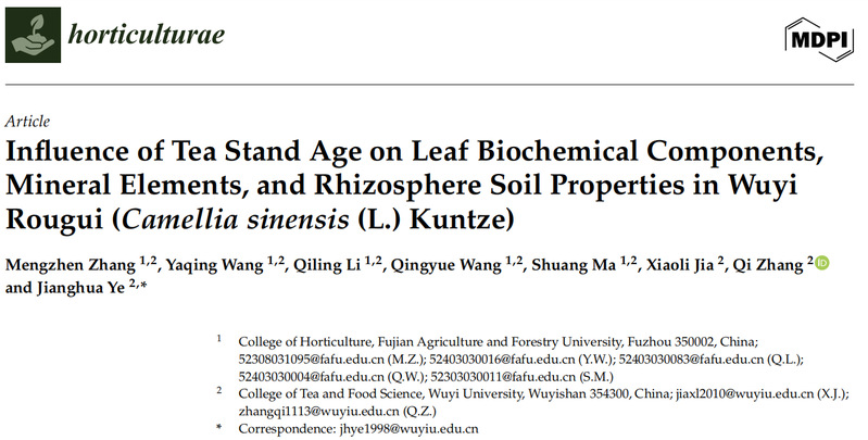 近日,我校茶与食品学院联培硕士研究生张梦珍为第一作者,叶江华教授为通讯作者,在国际知名学术期刊《Horticulturae》(JCR Q1)上发表题为“Effects of Different Stand Ages on the Biochemical Components and Mineral Elements of Wuyi Rougui Tea Leaves and Their Rhizosphere Soil Properties” 的研究论文。