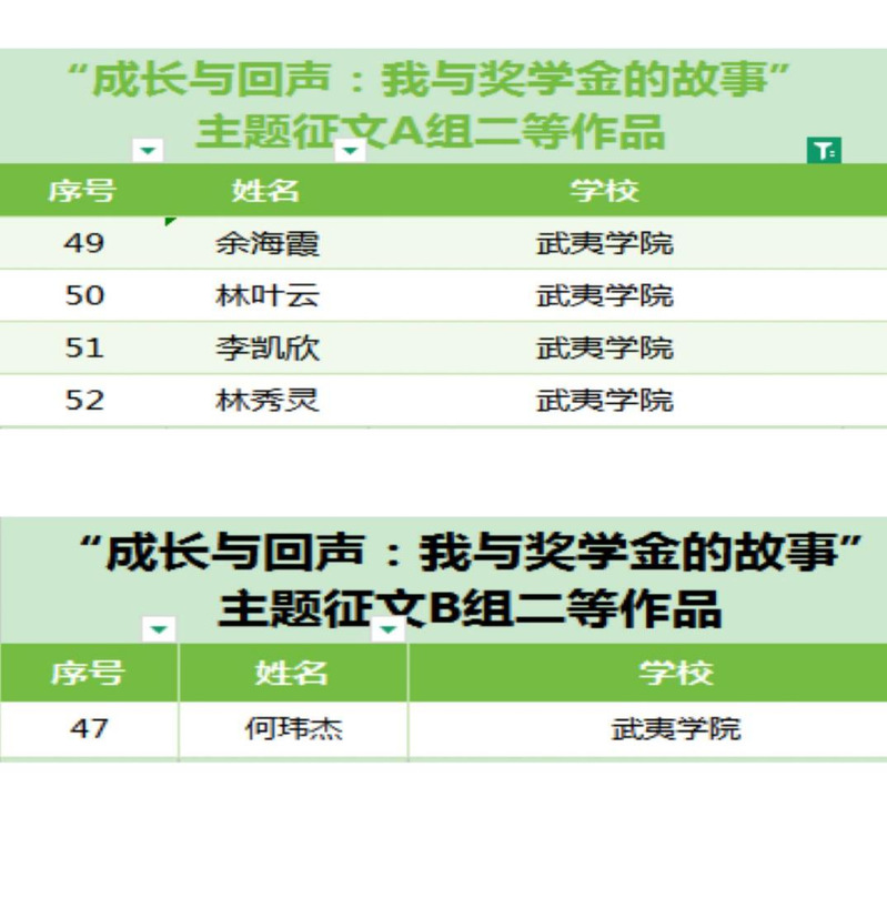 近日,由福建省学生资助管理中心、海峡教育报社联合主办的“成长与回声:我与奖学金的故事”主题征文评选结果正式公布。在本次征文活动中,我校师生踊跃参赛、笔耕不辍,以真挚笔触书写真实的经历与深刻的感悟,斩获多个奖项。其中,数学与计算机学院徐思鼎老师、艺术学院2024级美术学罗诗宇同学、土木工程与建筑学院2024级土木工程冉世权同学荣获B组一等作品;茶与食品学院2023级茶学余海霞、茶与食品学院2023级茶学林叶云、海峡成功学院2022级食品科学与工程李凯欣、艺术学院2024级视觉传达设计林秀灵同学荣获A组二等作品;数学与计算机学院2022级计算机科学与技术何玮杰同学荣获B组二等作品。